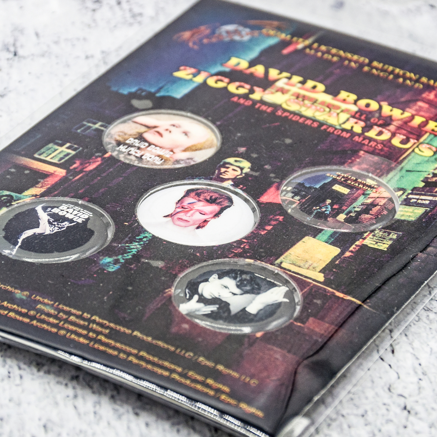 Подарунковий набір значків DAVID BOWIE - EARLY ALBUMS (iol-087). Цей товар є офіційним ліцензованим мерчем (Officially Licensed). Значки з якісним деталізованим зображенням, на пластиковій основі, обладнані надійною металевою шпилькою з тильного боку. На кожному значку на зворотному боці вказано номер партії. Кожен набір із п'яти значків упакований у блістер на картонній основі зі стилізованим зображенням гурту чи альбому, якому присвячений конкретний набір, має презентабельний вигляд, це ідеальний подарунок для справжніх фанатів гурту. Зроблено у Англії.