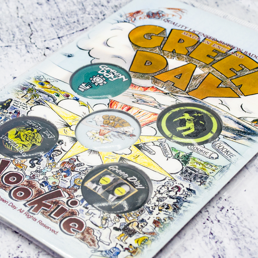 Подарунковий набір значків GREEN DAY - DOOKIE (iol-021). Цей товар є офіційним ліцензованим мерчем (Officially Licensed). Значки з якісним деталізованим зображенням, на пластиковій основі, обладнані надійною металевою шпилькою з тильного боку. На кожному значку на зворотному боці вказано номер партії. Кожен набір із п'яти значків упакований у блістер на картонній основі зі стилізованим зображенням гурту чи альбому, якому присвячений конкретний набір, має презентабельний вигляд, це ідеальний подарунок для справжніх фанатів гурту. Зроблено у Англії.