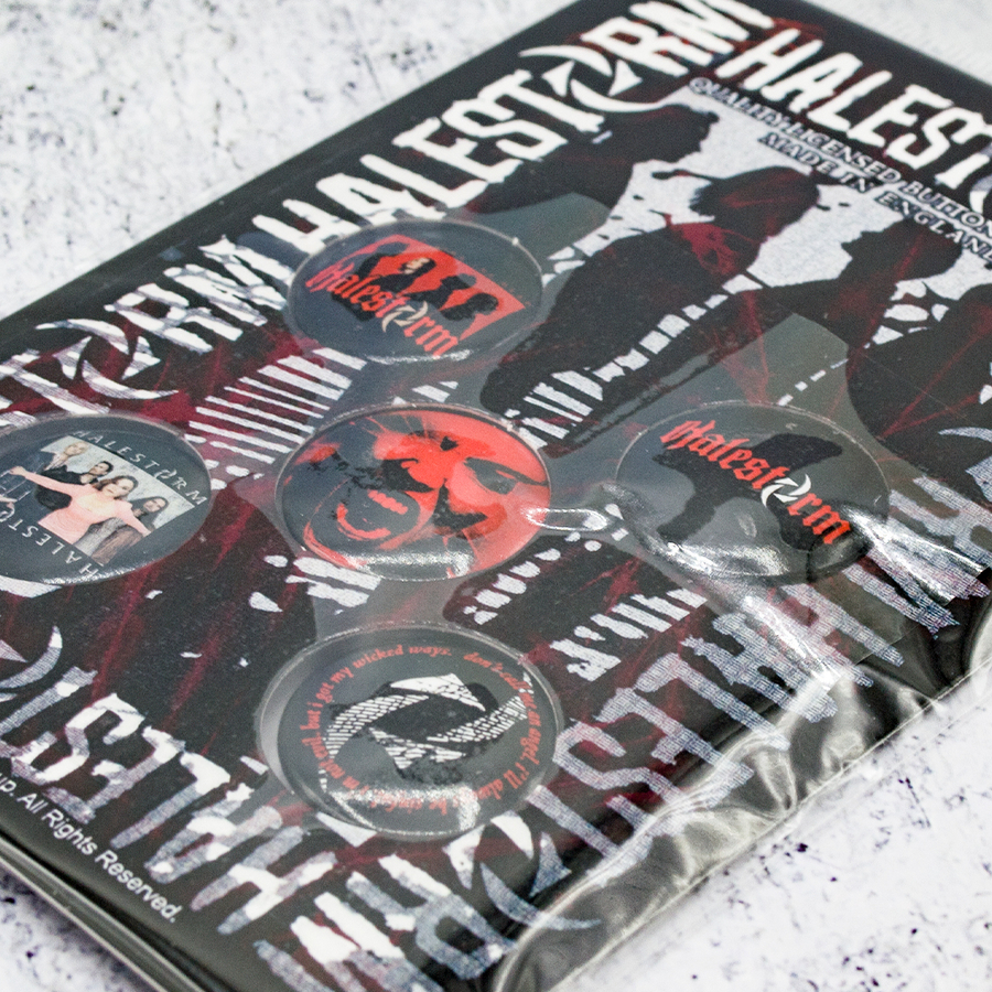 Подарунковий набір значків HALESTORM - PORTRAIT (iol-002). Цей товар є офіційним ліцензованим мерчем (Officially Licensed). Значки з якісним деталізованим зображенням, на пластиковій основі, обладнані надійною металевою шпилькою з тильного боку. На кожному значку на зворотному боці вказано номер партії. Кожен набір із п'яти значків упакований у блістер на картонній основі зі стилізованим зображенням гурту чи альбому, якому присвячений конкретний набір, має презентабельний вигляд, це ідеальний подарунок для справжніх фанатів гурту. Зроблено у Англії.