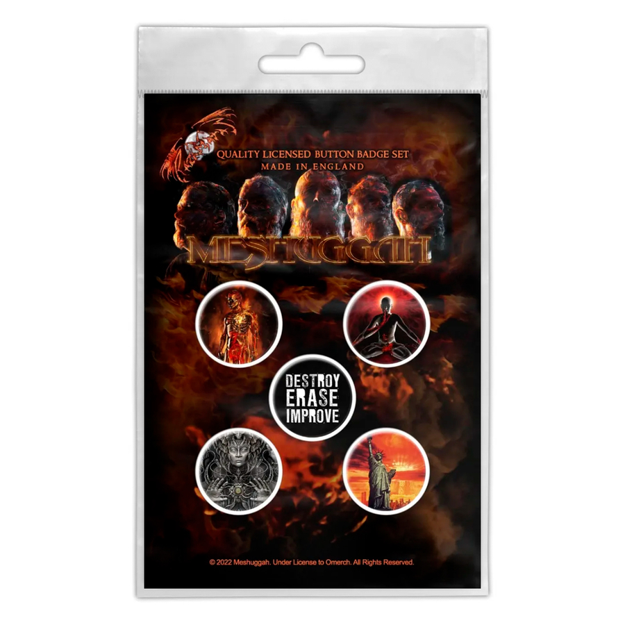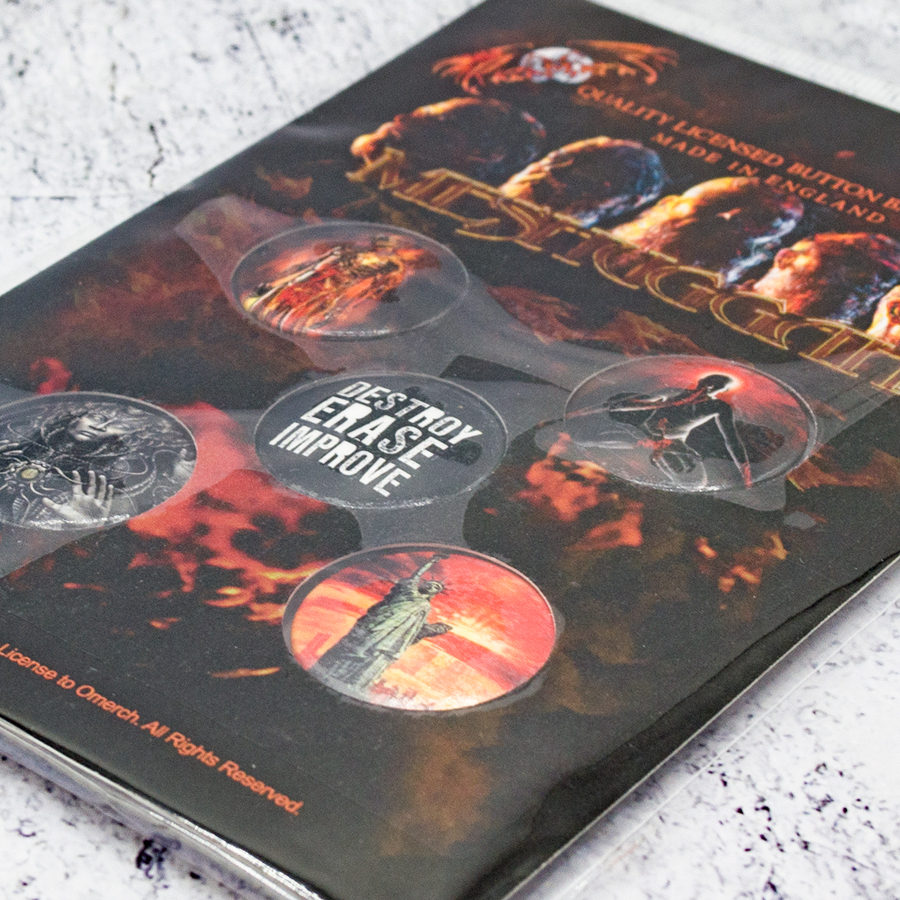 Подарунковий набір значків MESHUGGAH - IMMUTABLE (iol-020). Цей товар є офіційним ліцензованим мерчем (Officially Licensed). Значки з якісним деталізованим зображенням, на пластиковій основі, обладнані надійною металевою шпилькою з тильного боку. На кожному значку на зворотному боці вказано номер партії. Кожен набір із п'яти значків упакований у блістер на картонній основі зі стилізованим зображенням гурту чи альбому, якому присвячений конкретний набір, має презентабельний вигляд, це ідеальний подарунок для справжніх фанатів гурту. Зроблено у Англії.