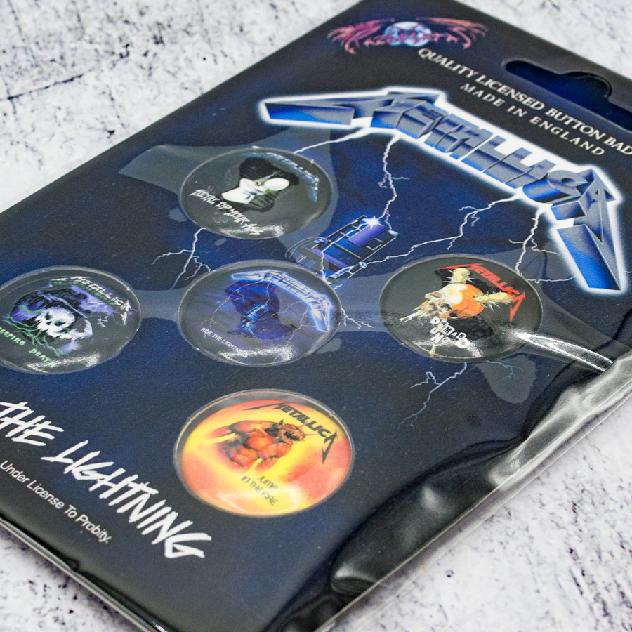 Подарунковий набір значків METALLICA - RIDE THE LIGHTNING (iol-046). Цей товар є офіційним ліцензованим мерчем (Officially Licensed). Значки з якісним деталізованим зображенням, на пластиковій основі, обладнані надійною металевою шпилькою з тильного боку. На кожному значку на зворотному боці вказано номер партії. Кожен набір із п'яти значків упакований у блістер на картонній основі зі стилізованим зображенням гурту чи альбому, якому присвячений конкретний набір, має презентабельний вигляд, це ідеальний подарунок для справжніх фанатів гурту. Зроблено у Англії.