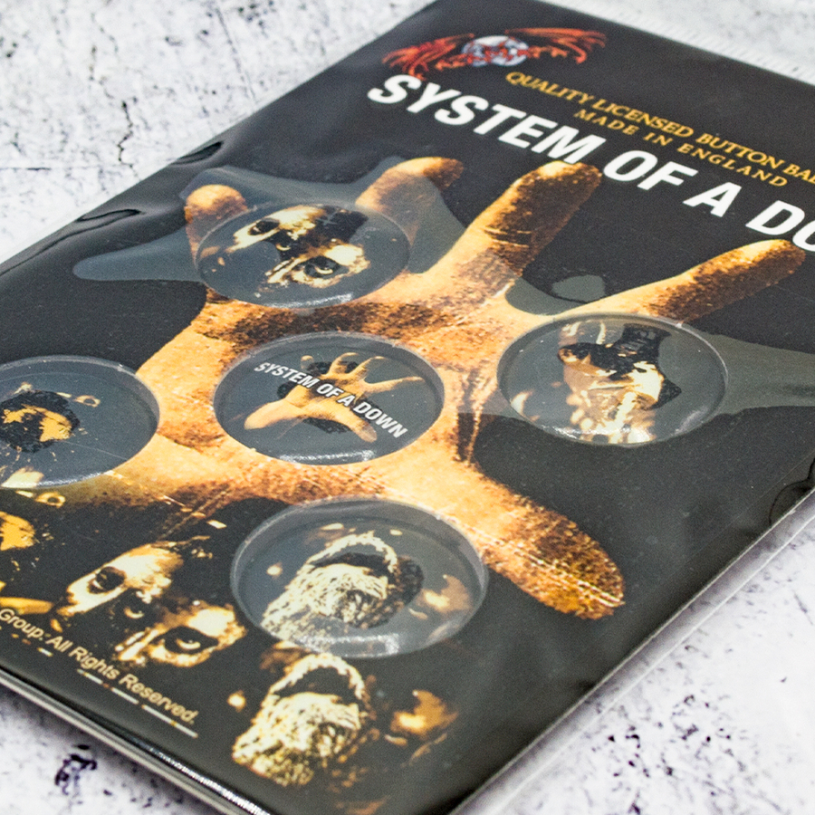 Подарунковий набір значків SYSTEM OF A DOWN - HAND (iol-012). Цей товар є офіційним ліцензованим мерчем (Officially Licensed). Значки з якісним деталізованим зображенням, на пластиковій основі, обладнані надійною металевою шпилькою з тильного боку. На кожному значку на зворотному боці вказано номер партії. Кожен набір із п'яти значків упакований у блістер на картонній основі зі стилізованим зображенням гурту чи альбому, якому присвячений конкретний набір, має презентабельний вигляд, це ідеальний подарунок для справжніх фанатів гурту. Зроблено у Англії.