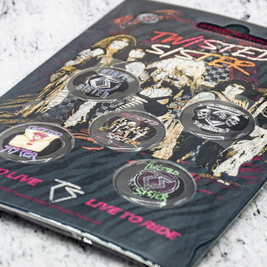 Подарунковий набір значків TWISTED SISTER - RIDE TO LIVE (iol-089). Цей товар є офіційним ліцензованим мерчем (Officially Licensed). Значки з якісним деталізованим зображенням, на пластиковій основі, обладнані надійною металевою шпилькою з тильного боку. На кожному значку на зворотному боці вказано номер партії. Кожен набір із п'яти значків упакований у блістер на картонній основі зі стилізованим зображенням гурту чи альбому, якому присвячений конкретний набір, має презентабельний вигляд, це ідеальний подарунок для справжніх фанатів гурту. Зроблено у Англії.