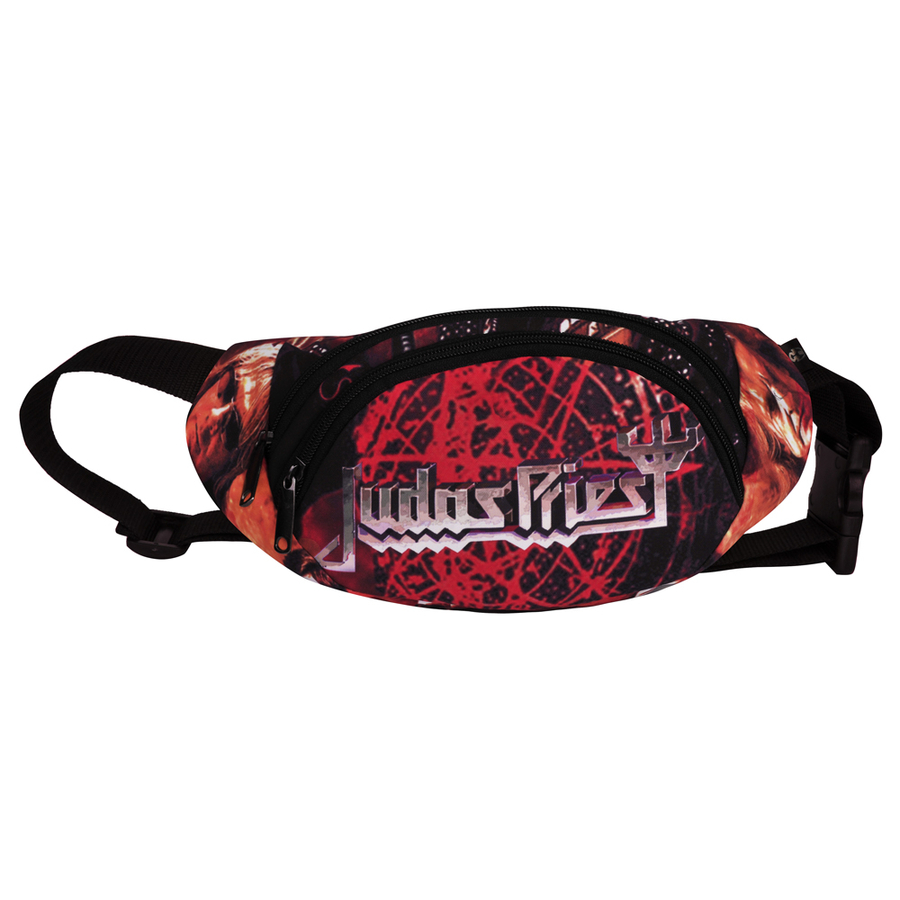 Поясна сумка Judas Priest Поясна сумка з міцної тканини з високоякісним сублімаційним друком. У сумці три відділення на блискавці. На тильній стороні сумки демпферна сітка, яка забезпечує циркуляцію повітря і захищає від протирання. Нейлоновий ремінь регулюється по довжині, обладнаний фастекс пряжкою.   Розмір: довжина - 30 см, висота - 15 см.