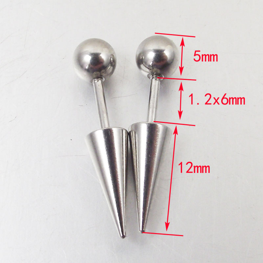 Сережка гвоздик з шипом і кулькою (мед.сталь, сталевий) ea-120 Загальна довжина 23 мм. Шип: довжина 12 мм, діаметр 5 мм. Шар: діаметр 5 мм. Стрижень: довжина між шипом та кулькою 6 мм, діаметр 1,2 мм