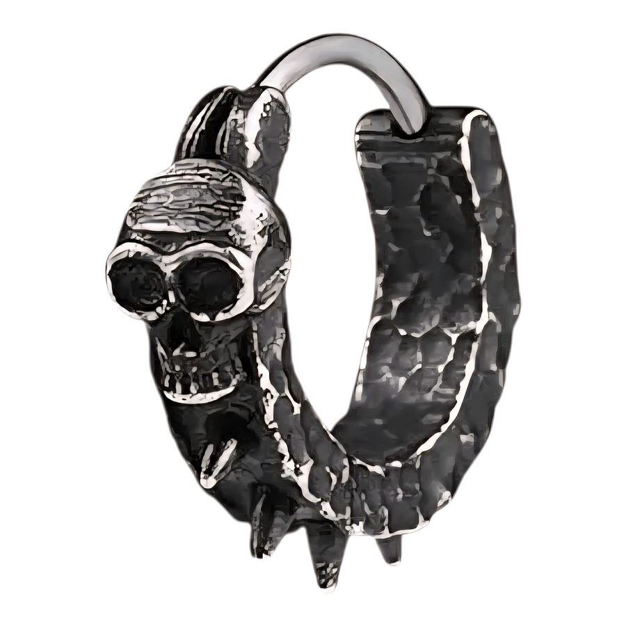 Сережка-кільце з Черепом та шипами, чорна (ea-170) Внутрішній діаметр 11 мм, зовнішній діаметр 16 мм, ширина 3,5 мм, товщина стрижня 1 мм. Матеріал медична сталь (не іржавіє, не темніє) Ціну вказано за одиницю товару
