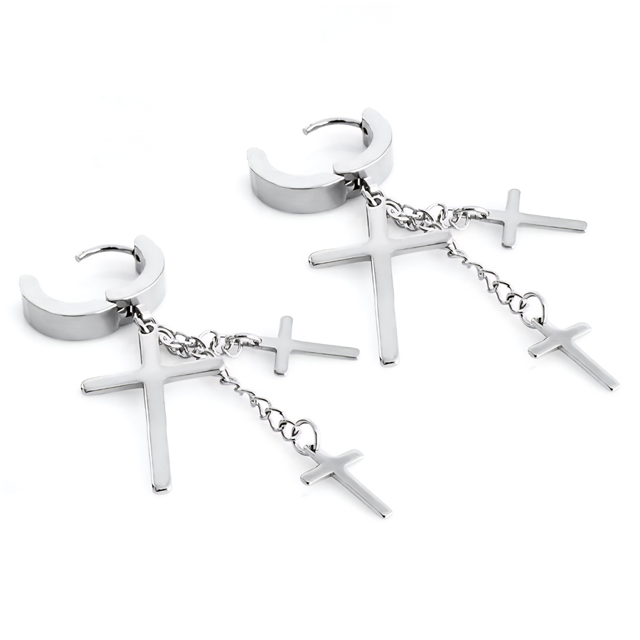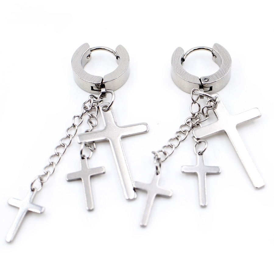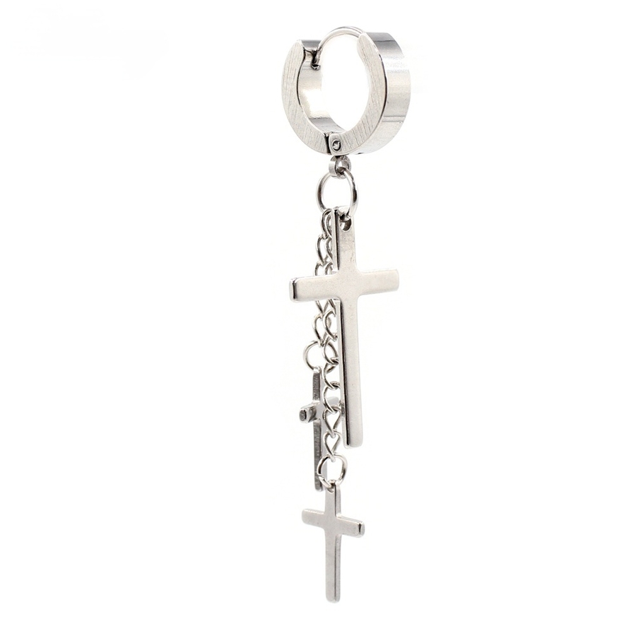 Сережка з трьома хрестами на ланцюжках (ea-171) Внутрішній діаметр 9 мм, зовнішній діаметр 14 мм, ширина 4 мм, товщина стрижня 1 мм. Матеріал медична сталь (не іржавіє, не темніє). Ціну вказано за одиницю товару