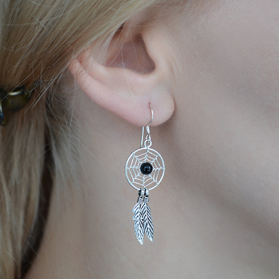 Сережка, ловець снів средний з чорним каменем (діаметр 15 мм, срібло 925 проба) (eas-048)