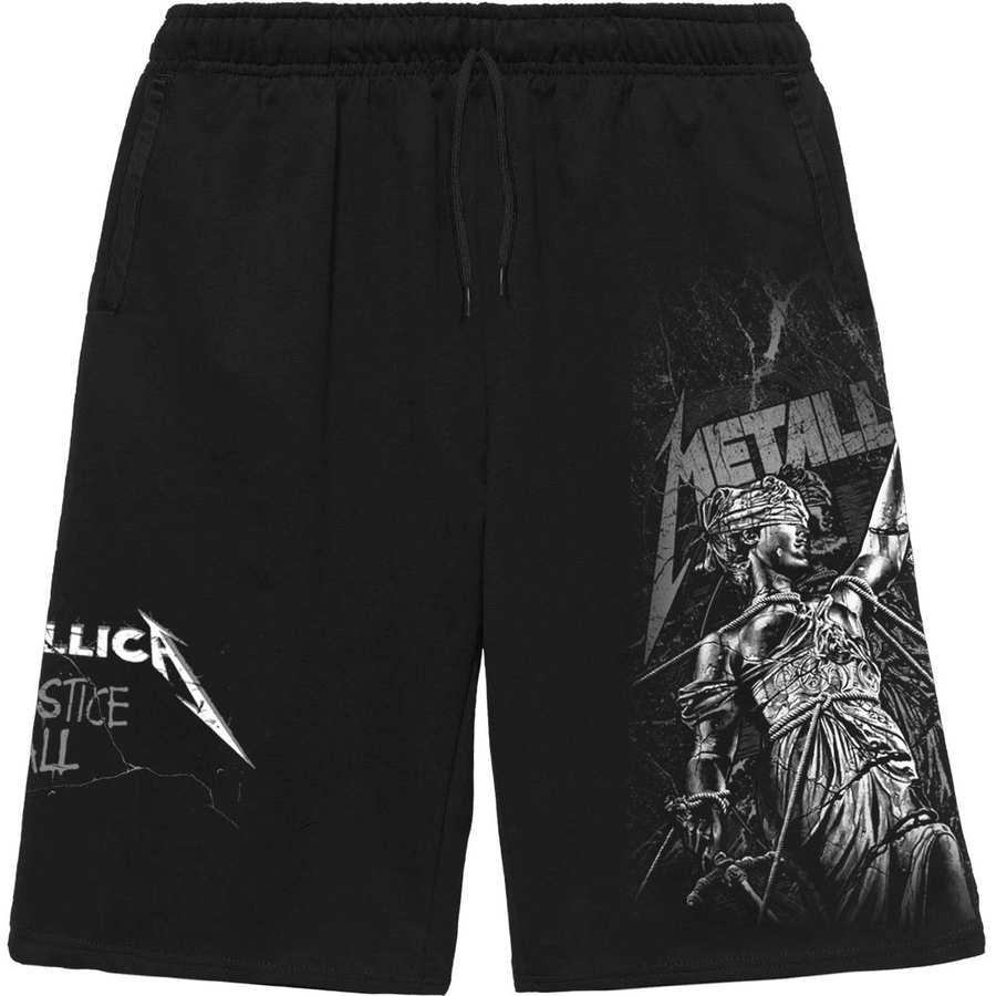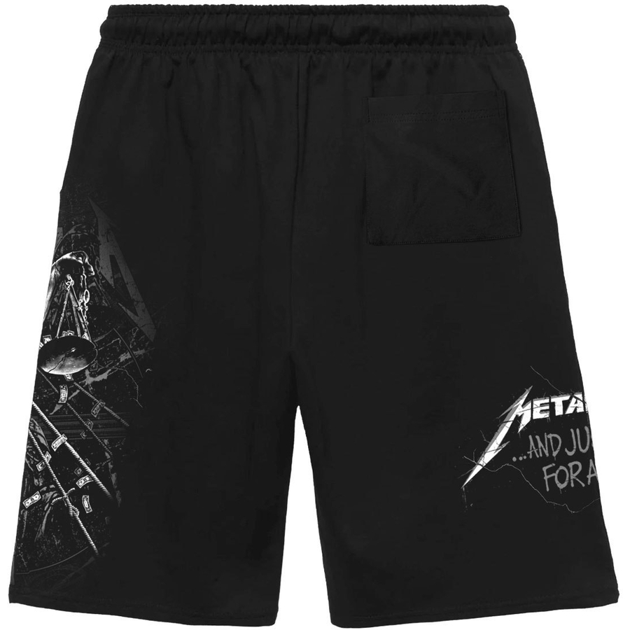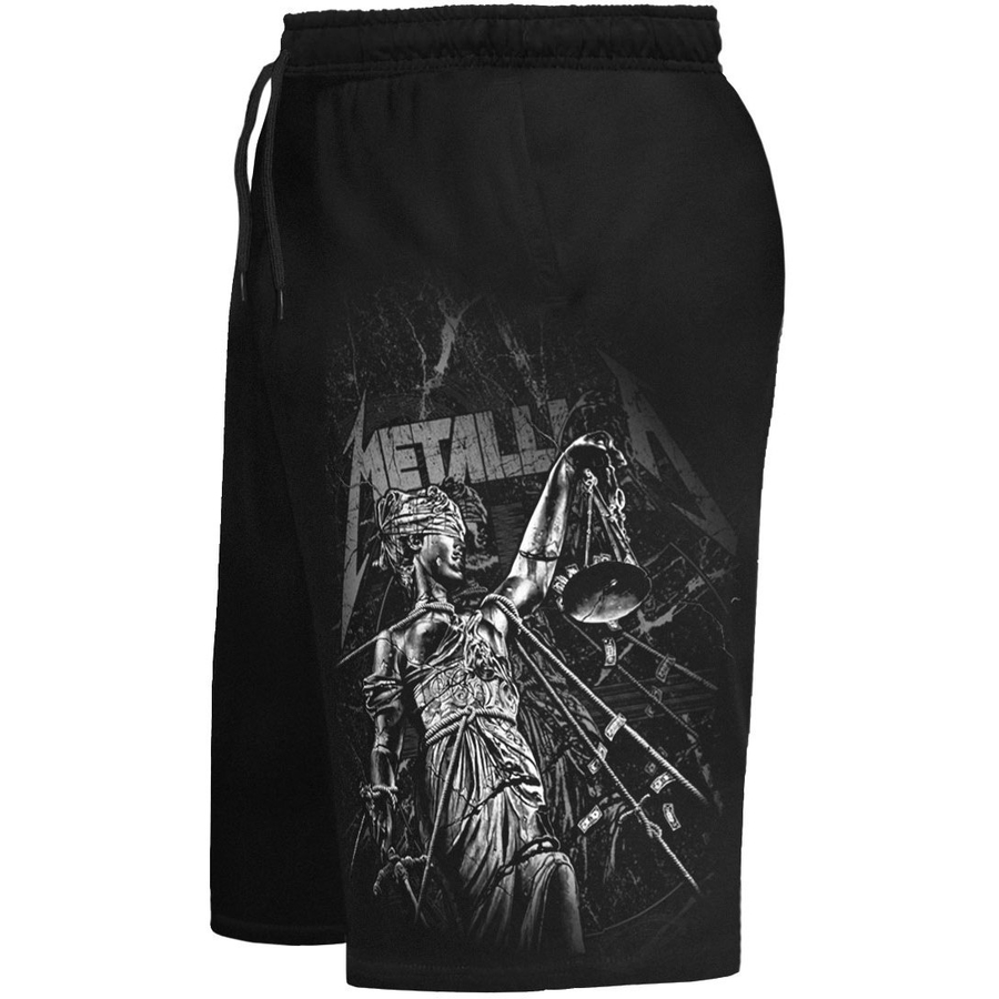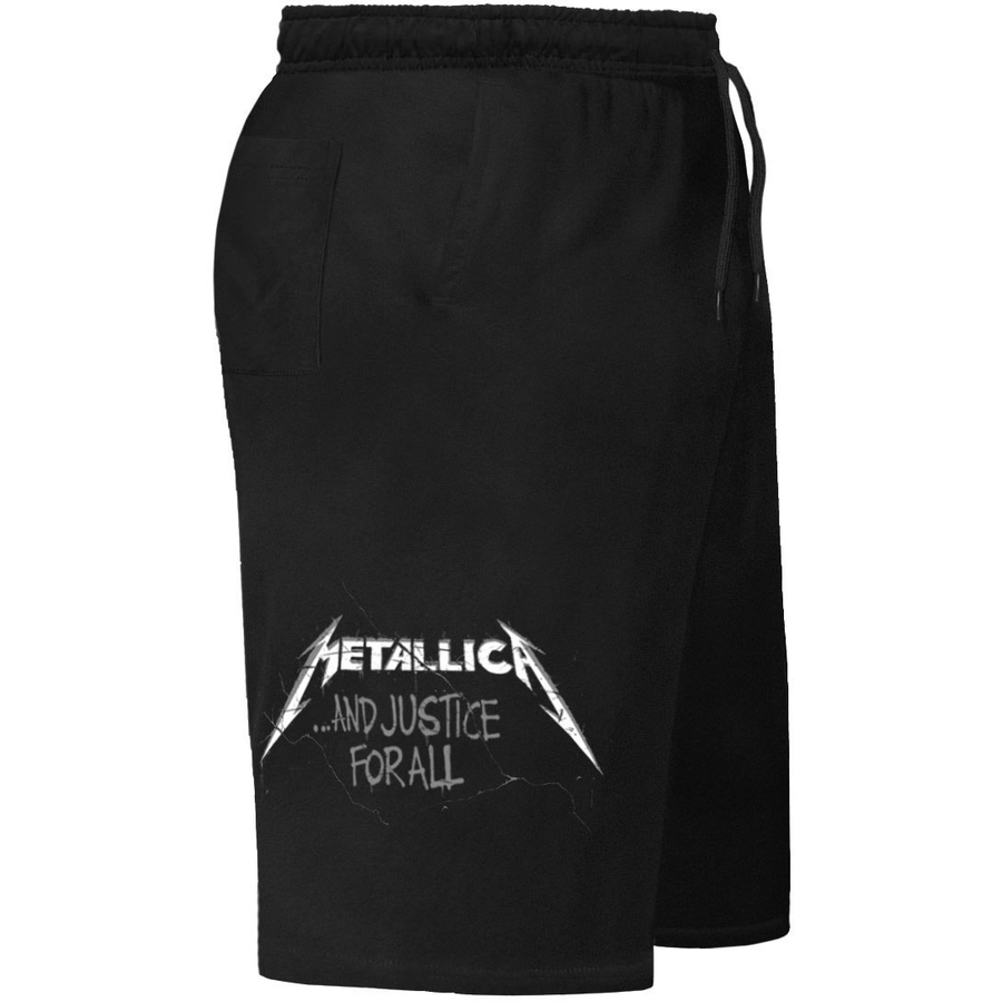 Шорти (rw) Metallica "And Justice For All" Тканина двонитка, склад: бавовна 95%, еластан 5%. Щільність тканини 247 г/м2. Завдяки еластану тканина трохи тягнеться. Малюнок нанесений методом шовкотрафаретного друку пластизолієвими фарбами виробництва EU, не тріскається і не випрається, якщо дотримуватись правил догляду. Прати при температурі до 30°C вивернутими навиворіт. Шорти обладнані широкою резинкою та додатково шнурком. На шортах три кишені: дві з обох боків і одна ззаду праворуч. Кишені досить місткі, вільно розміщується сучасний смартфон.
