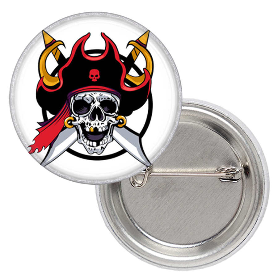 Значок Череп Пирата Материал: Металл Диаметр: 25 мм Значок закатной. Выполнен на металлической основе. Изображение покрыто специальной плотной пленкой, которая защищает его от повреждений, влаги, а также стирания. Округлая форма значка, метод изготовления, а также покрытие придают объем изображению на значке.
