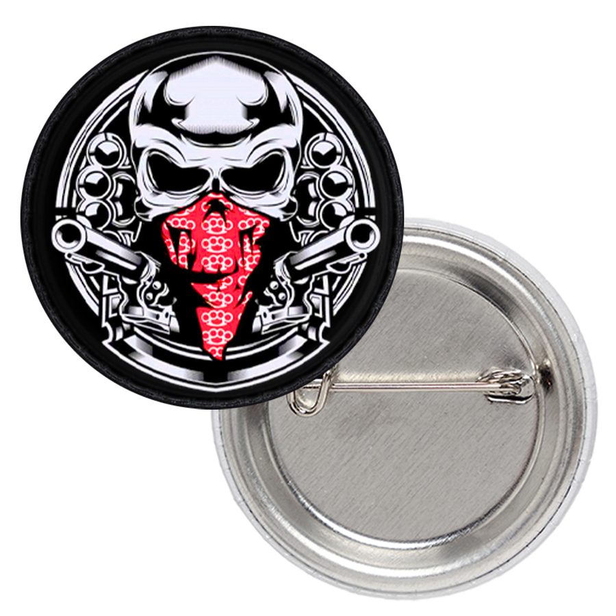 Значок Череп (Violens) Материал: Металл Диаметр: 25 мм Значок закатной. Выполнен на металлической основе. Изображение покрыто специальной плотной пленкой, которая защищает его от повреждений, влаги, а также стирания. Округлая форма значка, метод изготовления, а также покрытие придают объем изображению на значке.