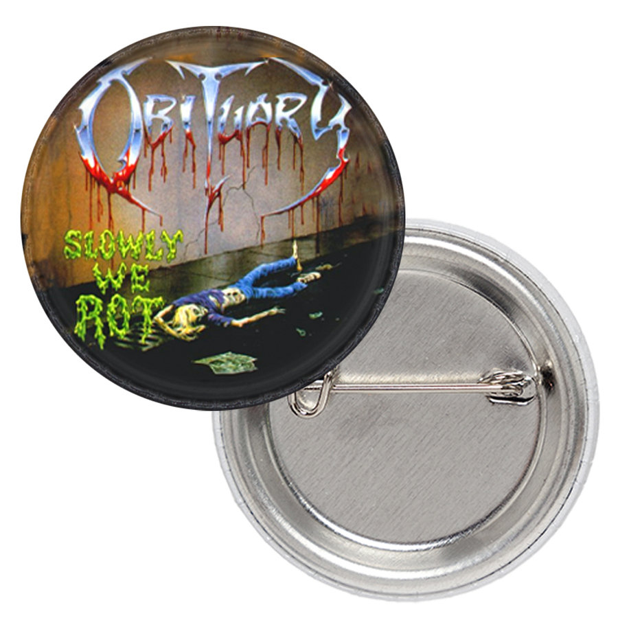 Значок Obituary (Slowly We Rot) Материал: Металл Диаметр: 25 мм Значок закатной. Выполнен на металлической основе. Изображение покрыто специальной плотной пленкой, которая защищает его от повреждений, влаги, а также стирания. Округлая форма значка, метод изготовления, а также покрытие придают объем изображению на значке.